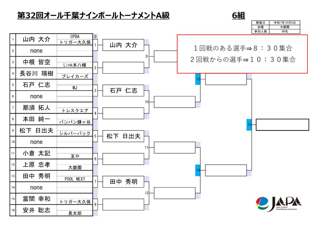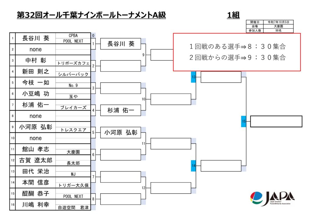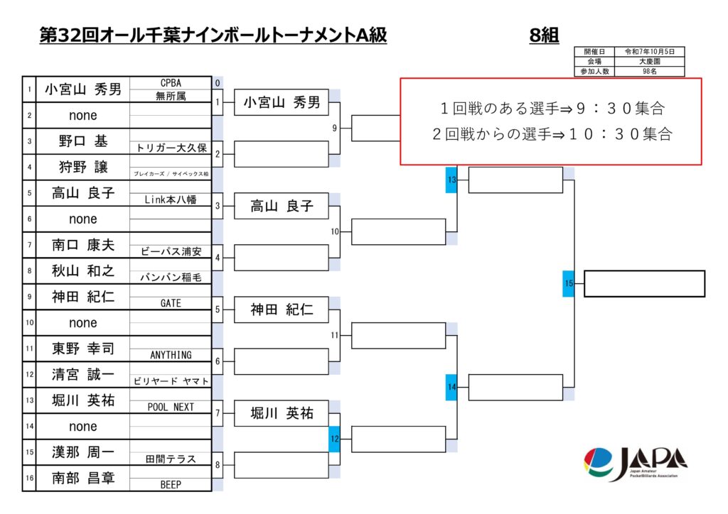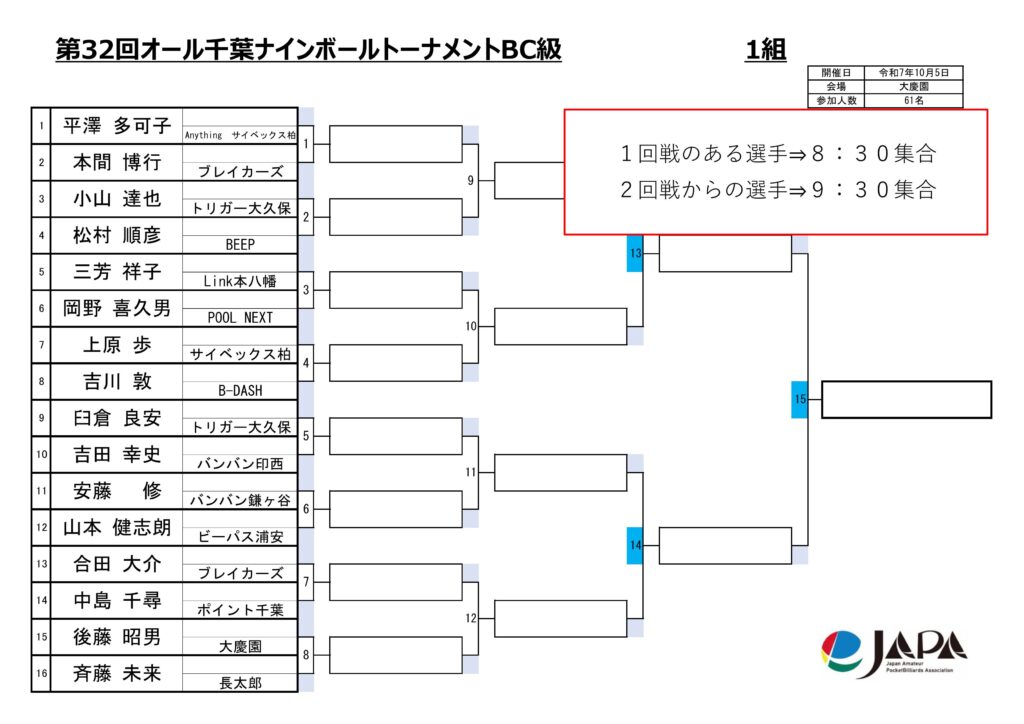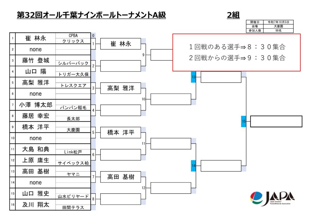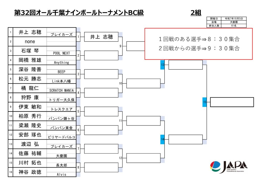 第32回オール千葉ナインボールトーナメントの各級組み合わせと集合時間をお知らせします。