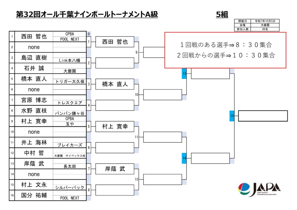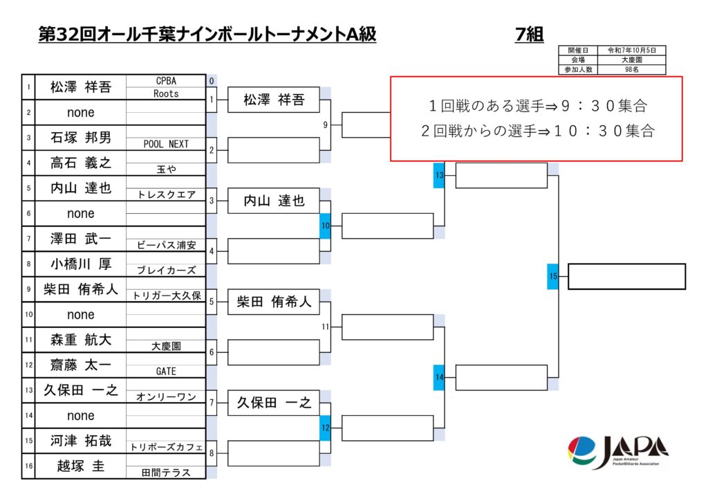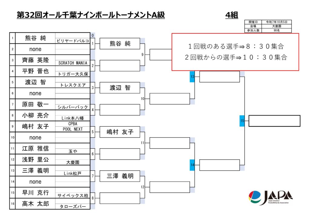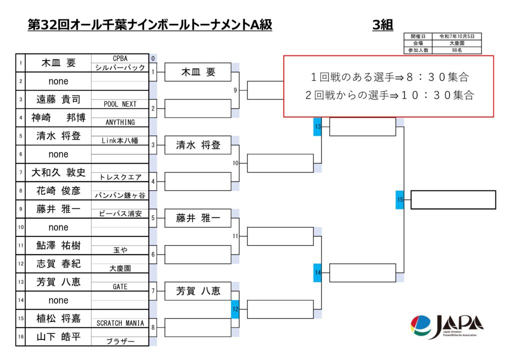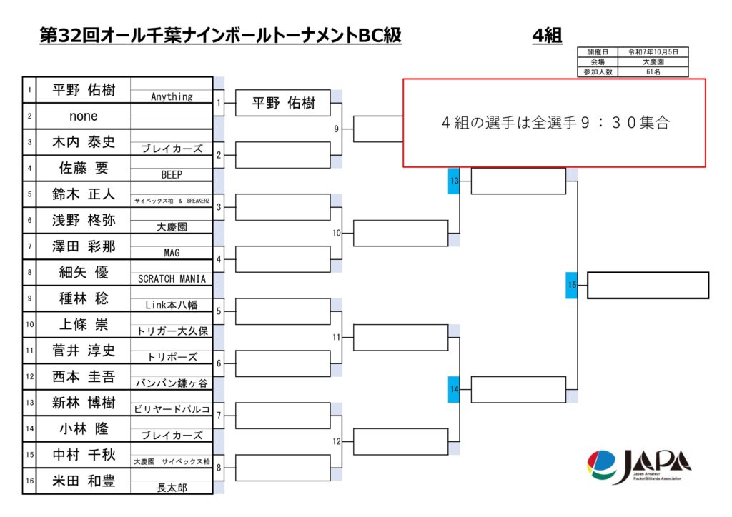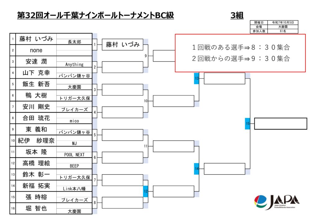 第32回オール千葉ナインボールトーナメントの各級組み合わせと集合時間をお知らせします。
