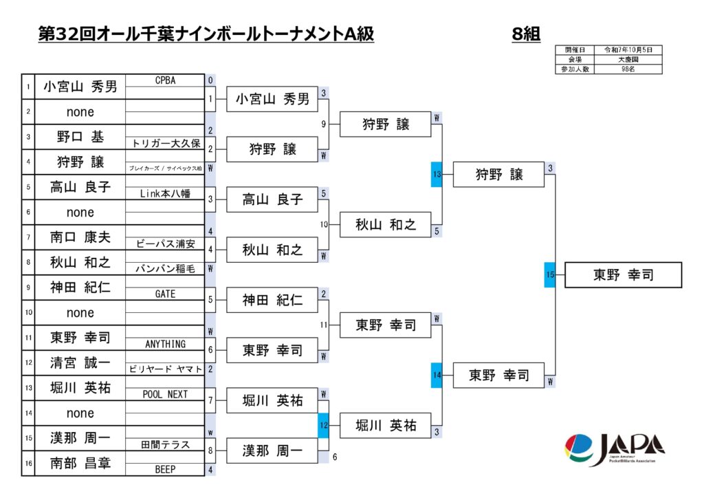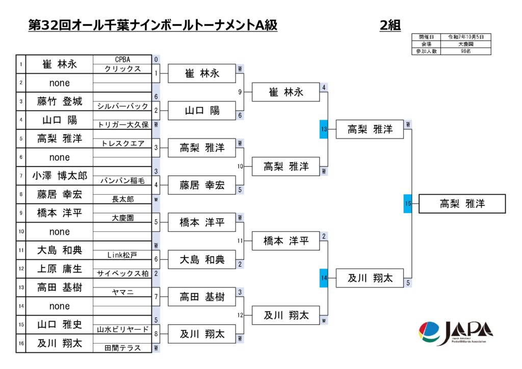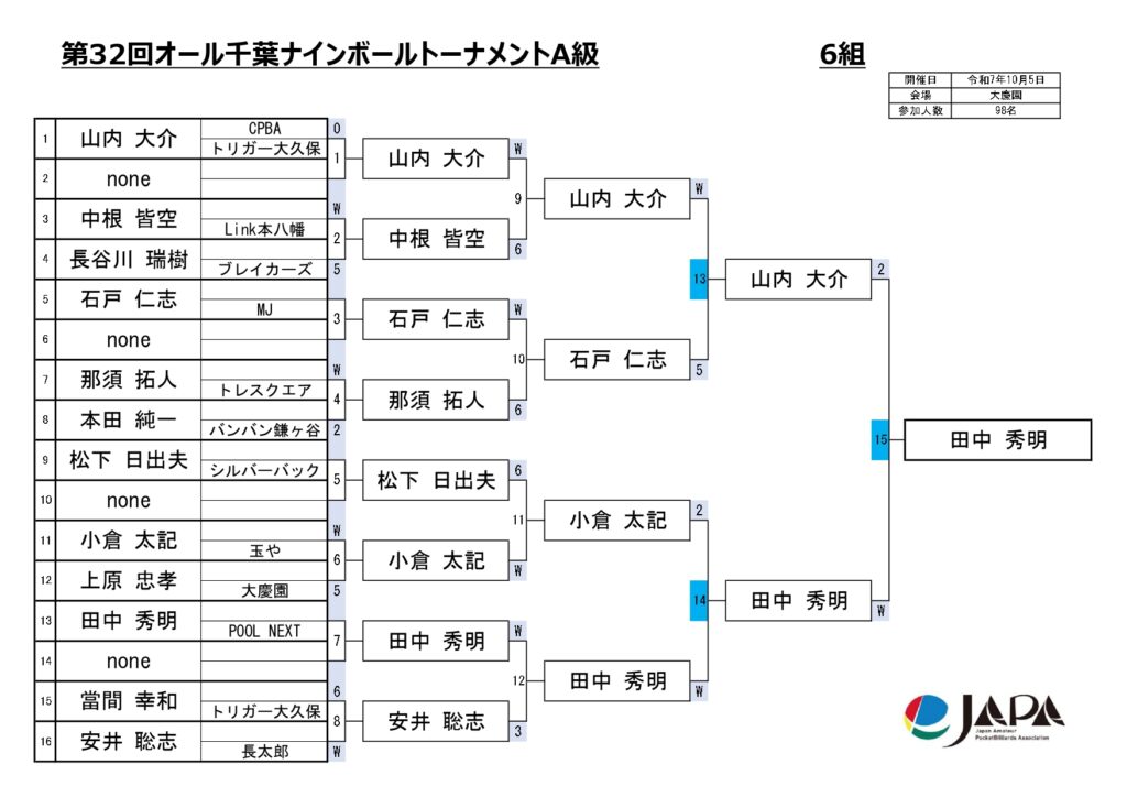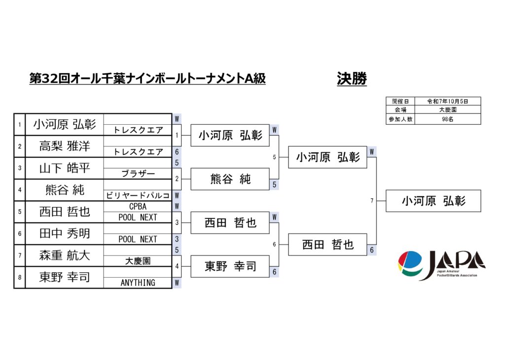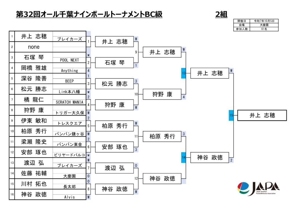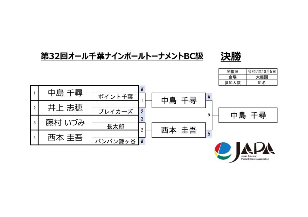 第32回オール千葉ナインボールトーナメントの結果は以下の通りとなります。