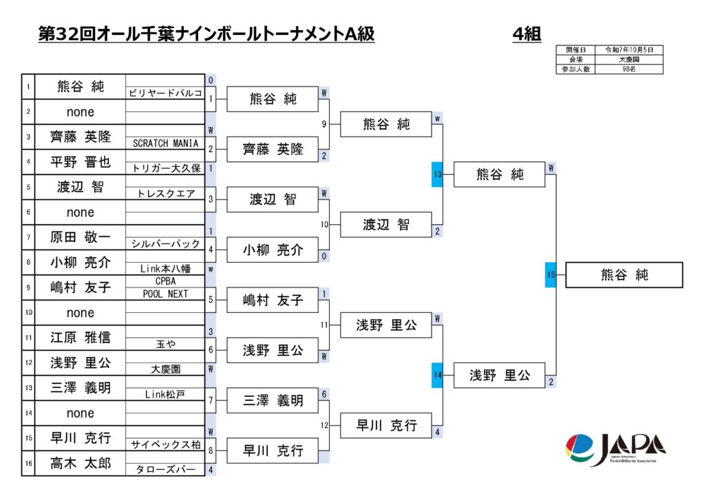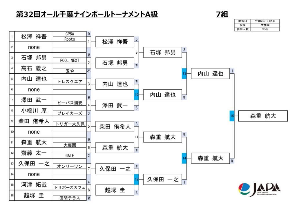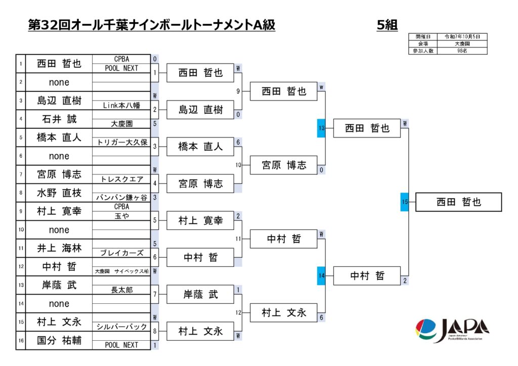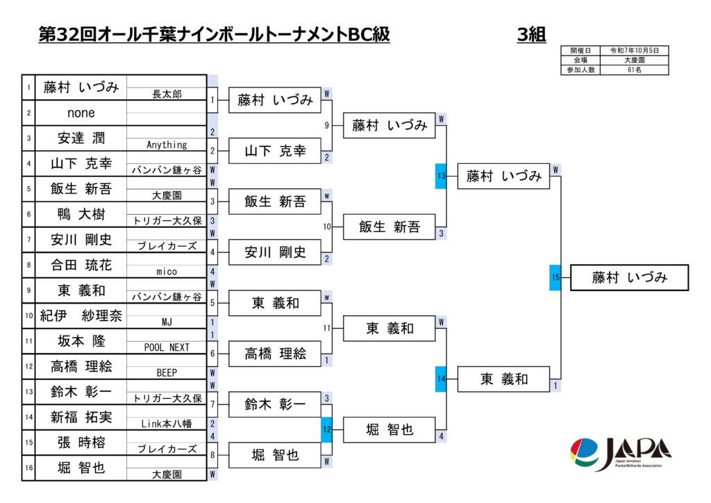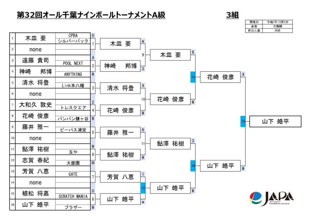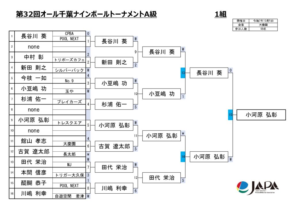 第32回オール千葉ナインボールトーナメントの結果は以下の通りとなります。